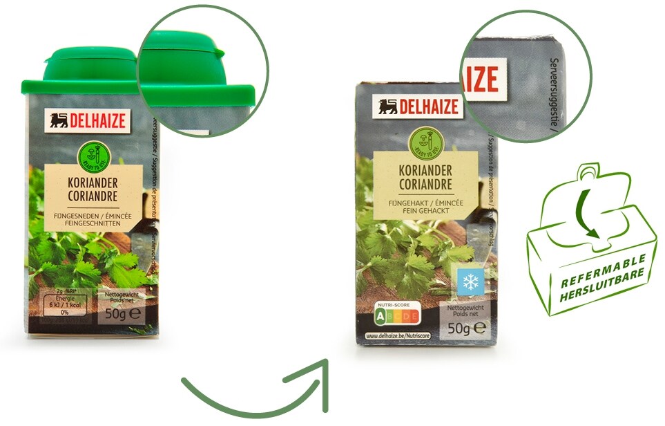 Onze diepvrieskruiden zitten niet meer in plastic, maar wel in een 100% kartonnen verpakking. Meer bepaald een flip’box! Deze kartonnen verpakking leg je horizontaal en gaat makkelijk open en dicht dankzij de inkeping op z’n zijkant.