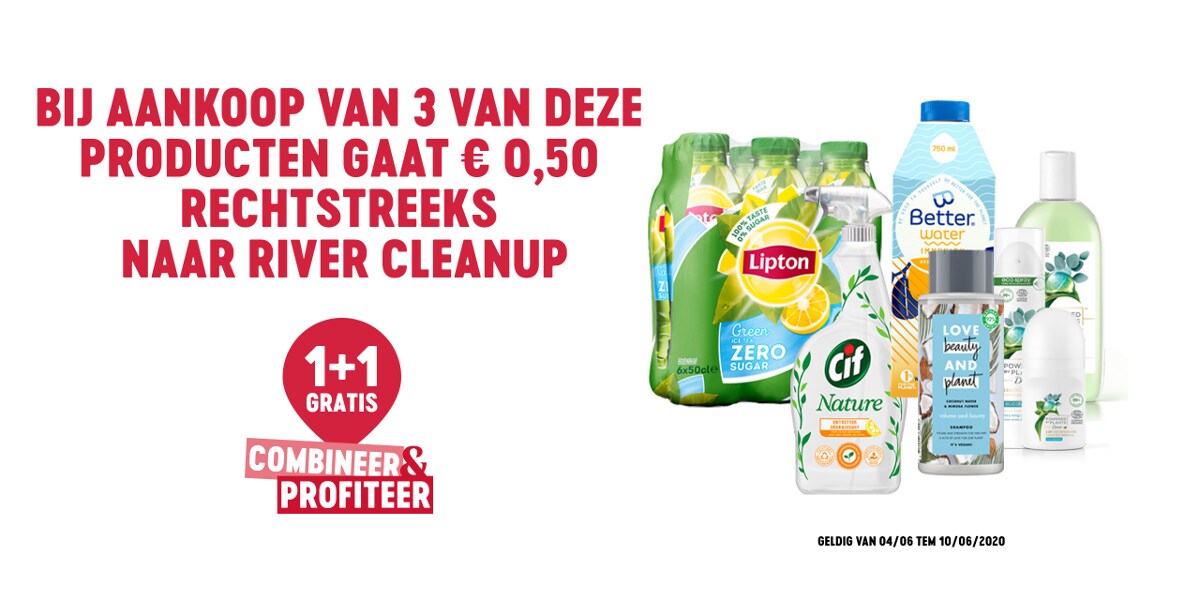 Delhaize en Unilever werken samen! Zo steunen we River Cleanup en helpen we samen plastic uit de rivieren te halen. Hoe we dat doen? Wel, als je 3 van onze deelnemende producten koopt, gaat er € 0,50 rechtstreeks naar River Cleanup. Benieuwd welke producten dat zijn? De volledige lijst deelnemende producten vind je hier!